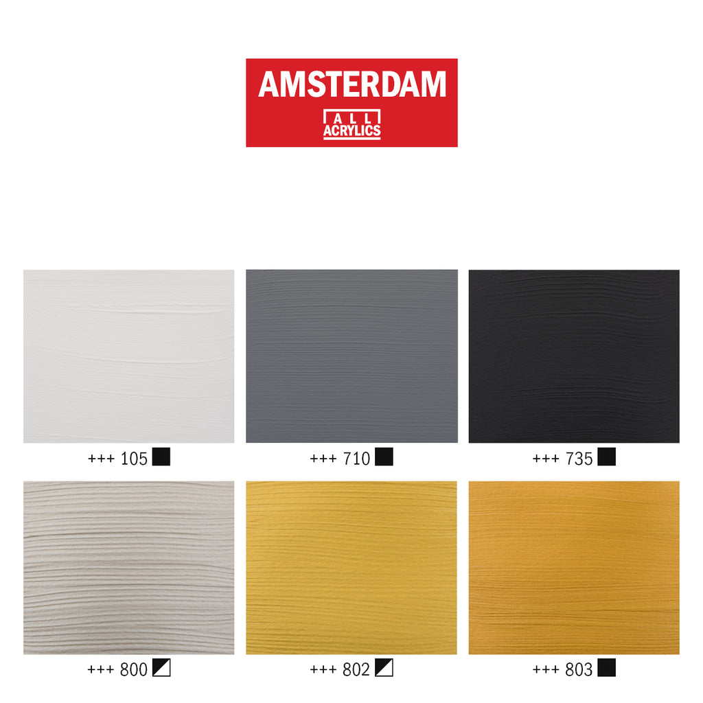 Set contains six 30ml bottles: Silver, Light Gold, Deep Gold, Neutral Grey, Titanium White & Oxide Black.