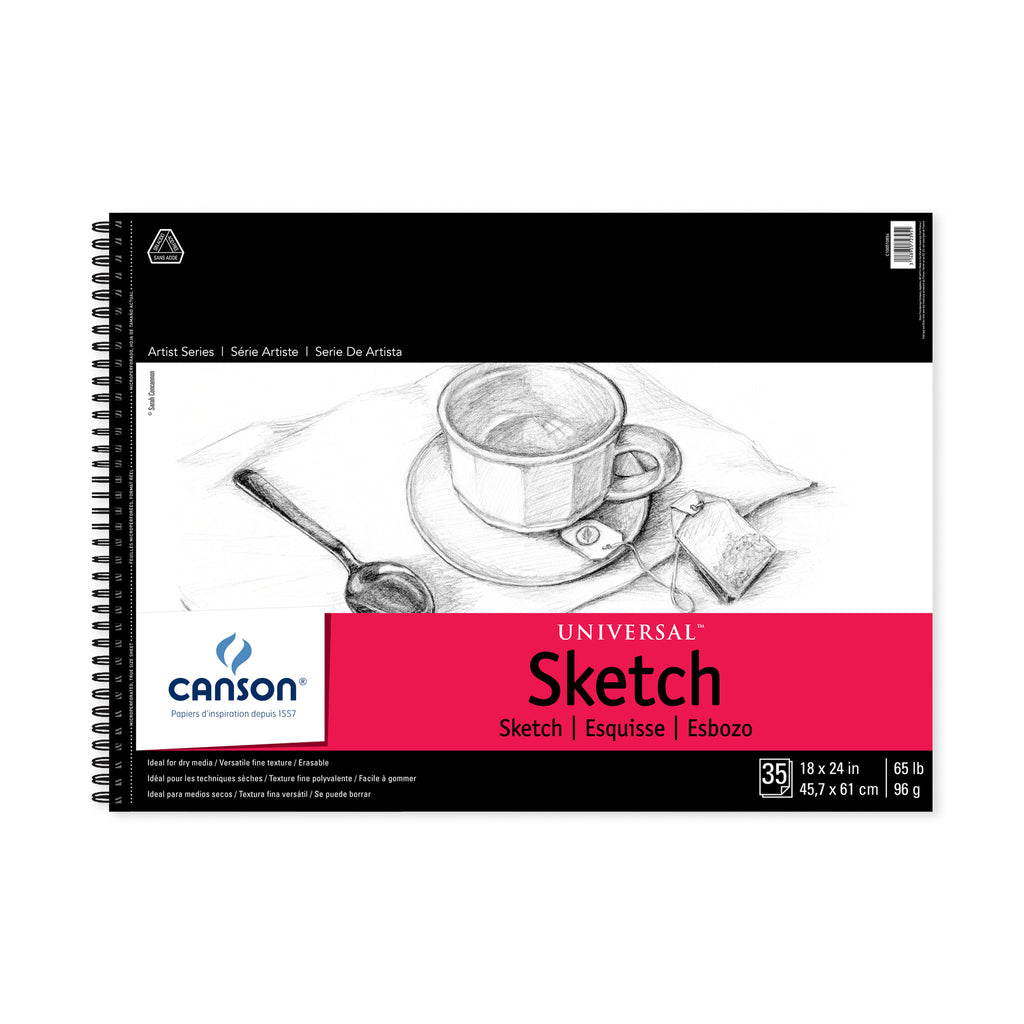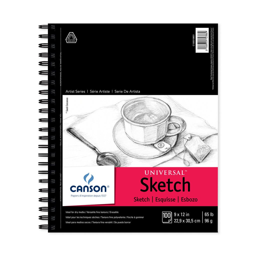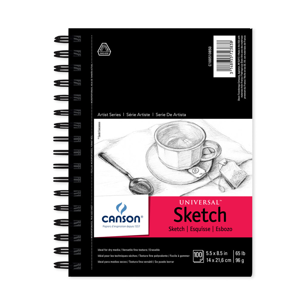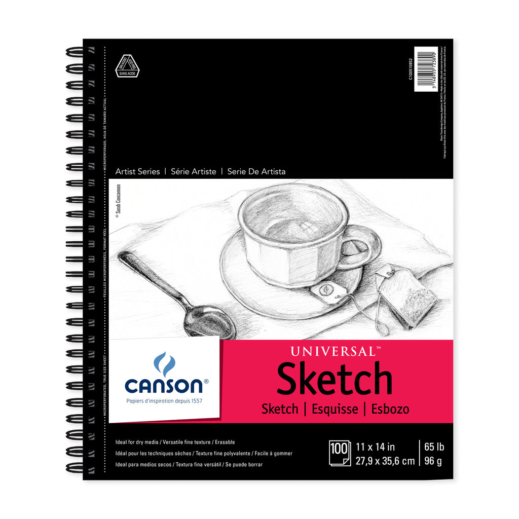 Canson's Universal Sketch pads are a heavier weight, rough-surfaced sketching paper that is ideal for use with charcoal, pastel, conte, pencil and pen. They are double wire bound with heavy chipboard back, and every 65lb sheet is micro-perforated to make removal clean and neat. The Universal Sketch pad has 100 sheets and is available in 9"x12", 12"x12", 11"x14" and 5.5"x8.5" (75 sheets).
