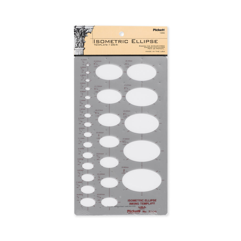 Ellipse templates are available in many styles to suite your drafting needs. Styles include Isometric Ellipse, Master Ellipse, and Giant Ellipse. Precision-engraved apertures ensure single-stroke accuracy. Templates come in a smoke grey color with a matte, non-glare finish. Templates feature ink risers to facilitate clean, smudge-free inking and easy pick up and repositioning. Chartpak templates are scratch-resistant and distortion-free. For best results, use with technical pen or pencil. Contains 27 ellipses of 35 16' projections in sizes from ?" to 2" with printed centering lines. Size: 5-7/8" x 10". Thickness: 0.030".