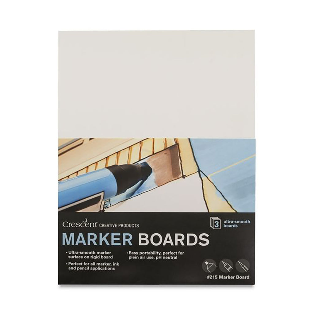 Crescent's 215 bright white marker board with a premium hot press surface and medium weight construction. Best for markers, ink, spray paint, airbrush and collage. Warp resistant. Available in 3-packs.
