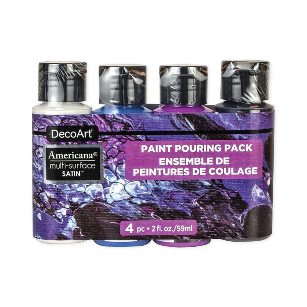 For use with DecoArt Pouring Medium, these colour combinations, chosen from the Americana Multi-Surface collection, makes it easy to achieve, vibrant stunning results. Just mix and pour! Colours in these sets were pulled together in a pre-tested color palette for optimum colour vibrancy and performance. This set is ideal for almost any surface. Contains 8 ounces (total) of paint to create stunning paint pours, When mixed with DecoArt Pouring Medium, each kit can create one 12" x 12" and one 16" x 20" canvas.The Galaxy paint value set includes four indoor/outdoor colors that will make out-of-this-world pours!Includes 4 x 2oz jars of Americana Multi-Surface Satin in: Cotton Ball, True Blue, Purple Sunset, Black Tie.