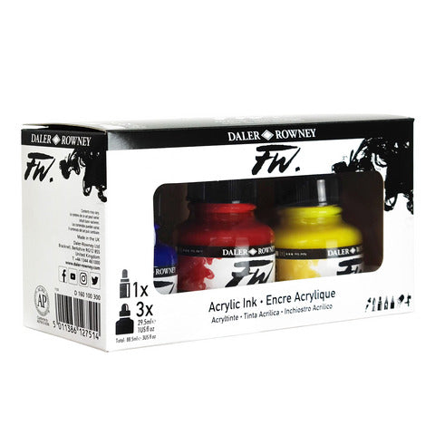 The FW Acrylic Ink Starter Set includes 3 x 29.5ml bottles in essential primary colours, plus a free empty FW Marker. These pigmented, water-resistant inks offer high lightfastness and exceptional versatility across multiple surfaces and techniques.