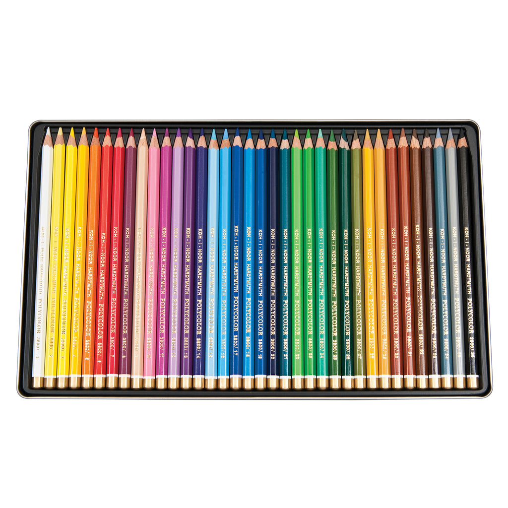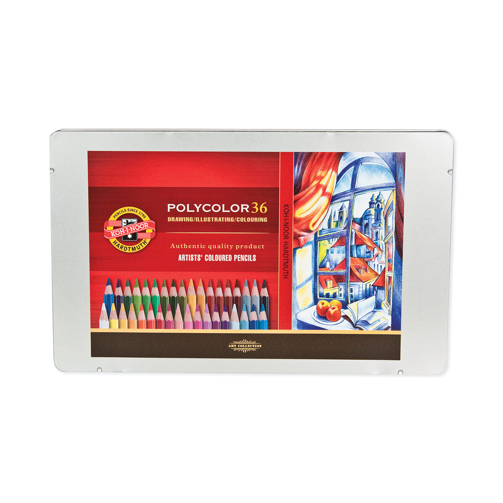 Polycolor is professional grade line of pencils that use Koh-I-Noor's unique blend of oils and premium pigments in every color core. These oils along with other binders allow the Polycolor pencil to create dense, even strokes without the use of heavy pressure. The 3.8mm lead diameter allows for shading with a broad edge, or fine sharpening for detail work. These leads are encased in California Cedar, a renewable resource that is the gold standard for pencil casings. The end result is a water-resistant, non-toxic pencil that layers and blends beautifully without a waxy buildup. Set of 36 coloured pencils includes: White, Light Yellow, Yellow, Dark Yellow, Orange, Vermillion, Carmine, Bordeaux-Red, Beige, Pink, Light Violet, Red Violet, Violet, Blue Violet, Ice Blue, Sky Blue, Cobalt Blue, Light Blue, Dark Blue, Prussian Blue, Blue Green, Bice Green, May Green, Pea Green, Grass Green, Dark Green, Dark Olive Green, Gold Ochre, Dark Ochre, Indian Red, Light Brown, Brown, Dark Brown, Bluish Grey, Grey & Amp; Black.