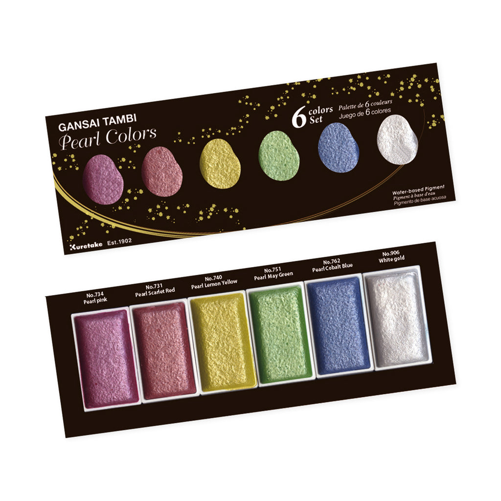 Traditional Japanese pan watercolours for professional artists and crafters. The rich and intense colours of Gansai Tambi are handcrafted, professional quality pigments. These high-caliber watercolours are perfectly blendable with a creamy-smooth feel that show up on dark paper. Solid watercolour cakes for professional artists and crafters. Ideal for sketching, illustration, sumi-e and more! Set includes: 734 Pearl Pink, 731 Pearl Scarlet Red, 740 Pearl Lemon Yellow, 751 Pearl May Green, 762 Pearl Cobalt Blue, 906 White Gold