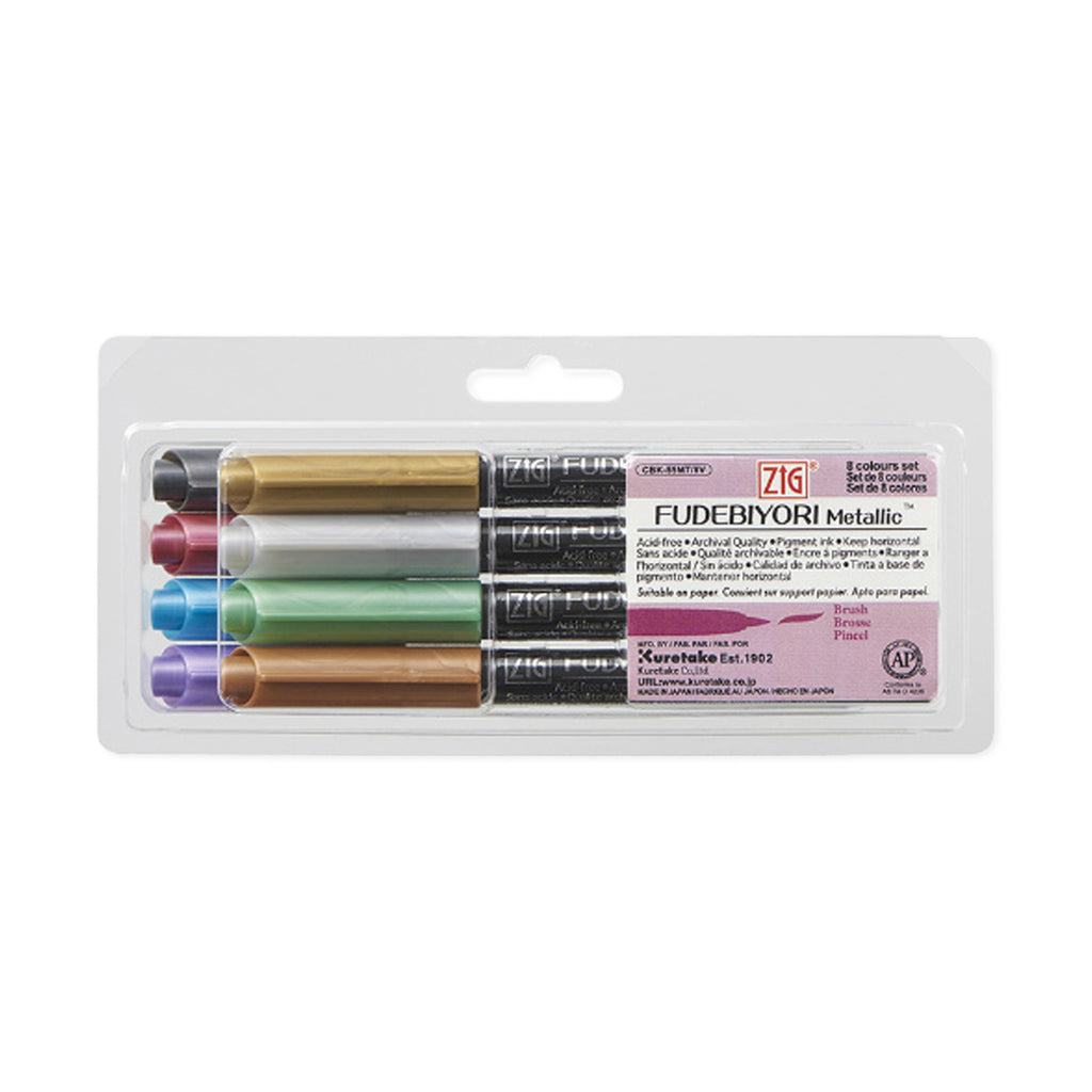 The Fudebiyori brush pen with water-based dye is optimized for brush lettering and stroke weight control. The semi-flexible tip allows easy control and great pressure response against surfaces and is effective for both detail and larger areas. The spectrum of colours, including metallic, provides a wide range of possibilities. Odourless and xylene free. Set includes: Gold, Silver, Green, Copper, Violet, Blue, Red, Black - all metallic!