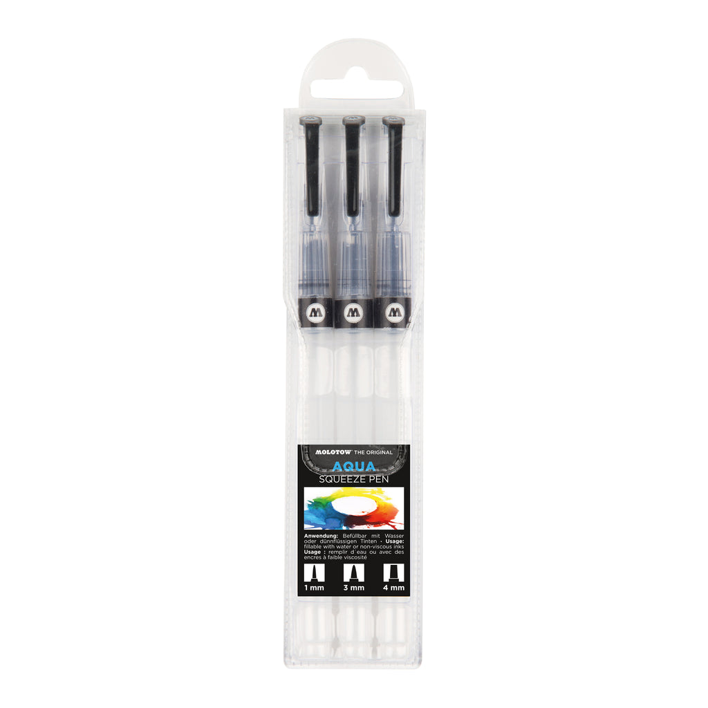 With the Molotow GRAX Aqua Squeeze Pen, colouring is a piece of cake! These sophisticated application tools can be easily filled with nearly all fluid inks or water (and are compatible with alcohol-based inks). By simply pushing the squeeze body, the paint flow can be regulated. These pens are even good for small artists. The brush pen tips are similar to real brushes, and have an approximate 20ml fluid capacity. The empty, refillable squeeze pens come in a set of 3.