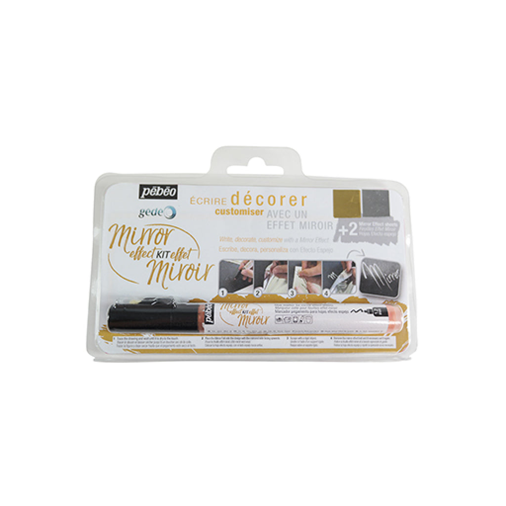 A fun and simple way to add add a touch of shine to your mixed media creations. Although Pébéo has designed these to work on their own, they will work well with other. The multi-surface, high gloss sheets of mirror effect foil mimic metal leaf to highlight and enhance artworks. Draw with gilding paste directly from the tube or spread over selected area with a painting knife on most surfaces and allow to dry. With light pressure, apply the the leaf and lift to transfer the coated mirror effect. Dry leaf can be gently buffed with a soft cloth. Set contains: 1 glue marker & 2 mirror effect sheets in gold/silver).