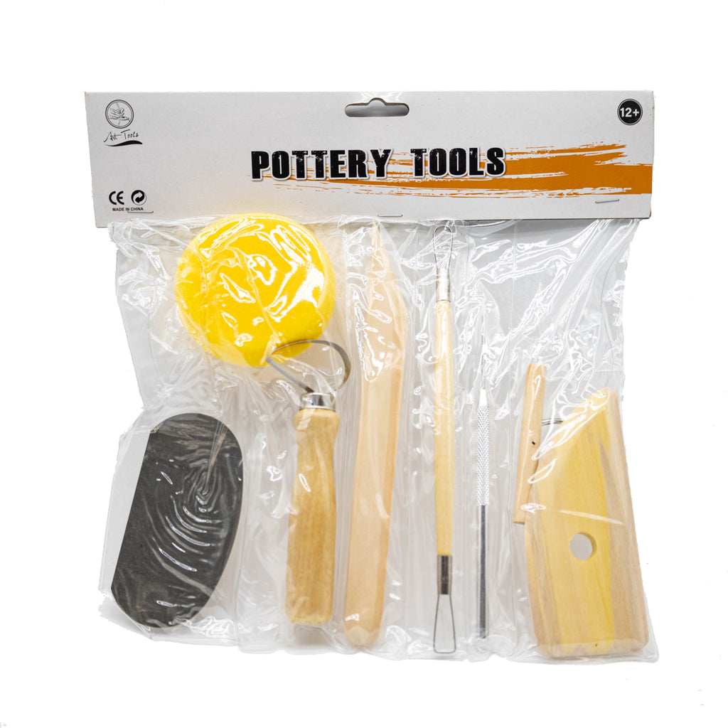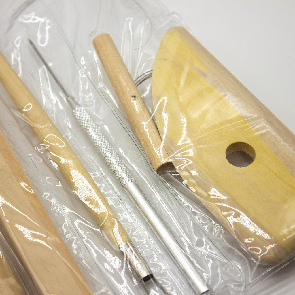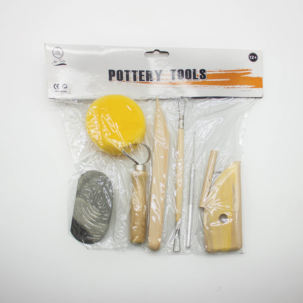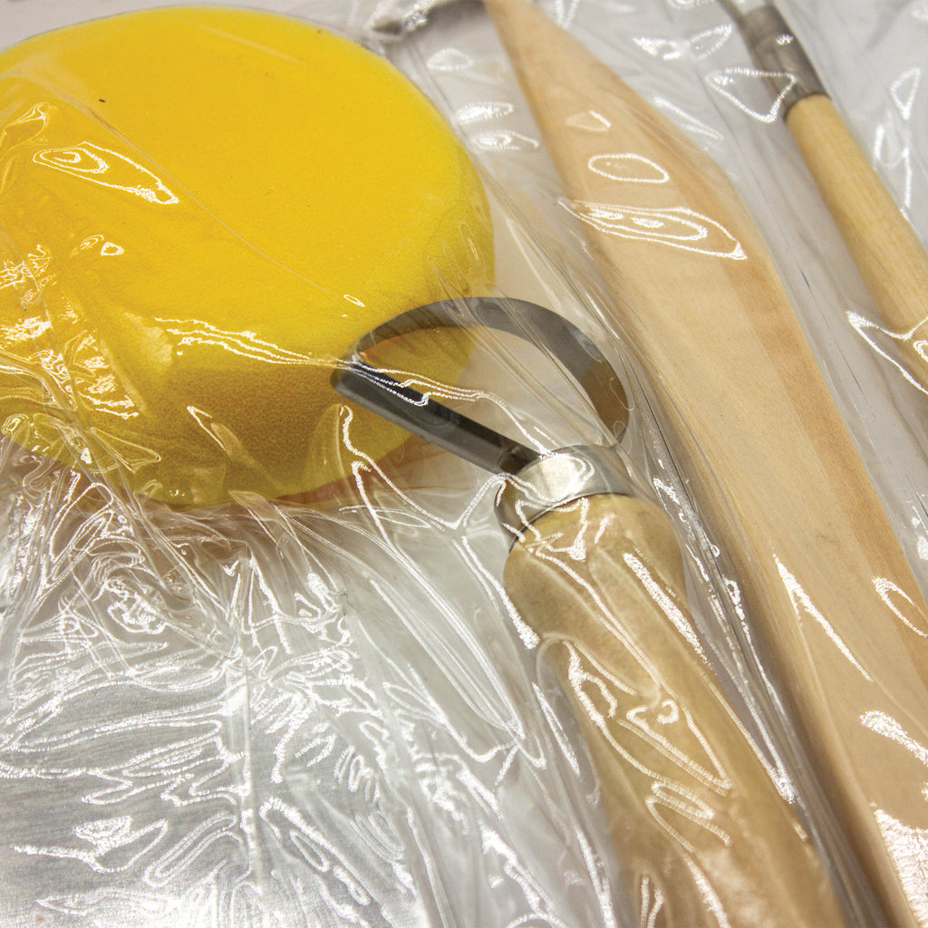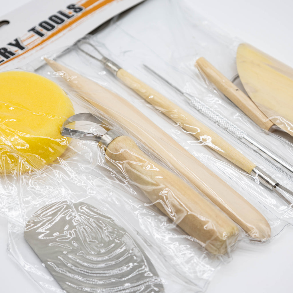 The assorted Pottery Tool Set includes a potter's rib, steel scraper, wood modeling tool, needle tool, ribbon tool, loop tool, one sea sponge and a wire clay cutter.