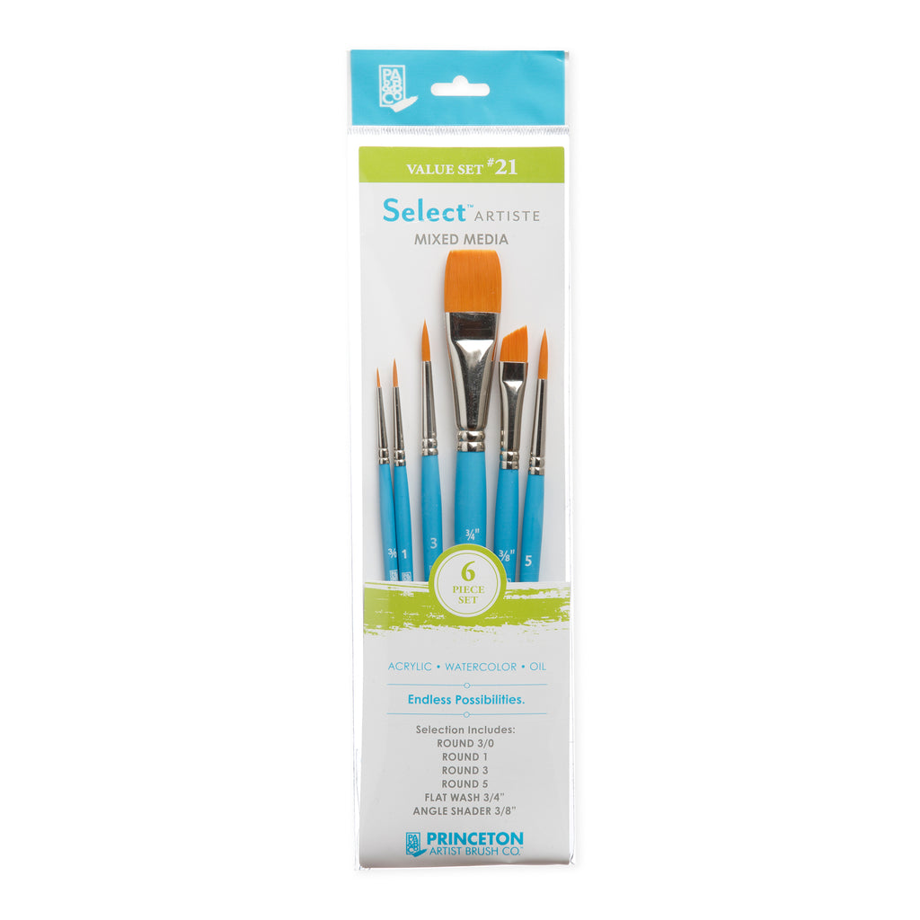 These value brush sets offer quality mixed media brushes at value pricing. The Princeton Select Artiste Series' perfectly designed yet distinctive shapes were developed by an artist for artists exploring decorative and avant-garde painting techniques. These high quality brushes mix the traditional with a sense of excitement and, like every Princeton brush, are handcrafted and tested for beautifully consistent performance. Short-handled, multi-media Select brushes range from synthetic to natural hair (traditional shapes & sizes contain blended golden taklon, and specialty shapes include a variety of natural hair & synthetic blends), all with matte turquoise handles and bright nickel-plated brass ferrules. Fine brushes for multiple mediums (acrylic, watercolour & oil) and techniques. Each thoughtfully selected mixed-media brush set contains an educational literature brochure. Unique shapes offer endless possibilities for artists. Set of 6 contains: Round 3/0, Round 1, Round 3, Round 5, Flat Wash 3/4" & Angle Shader 3/8".