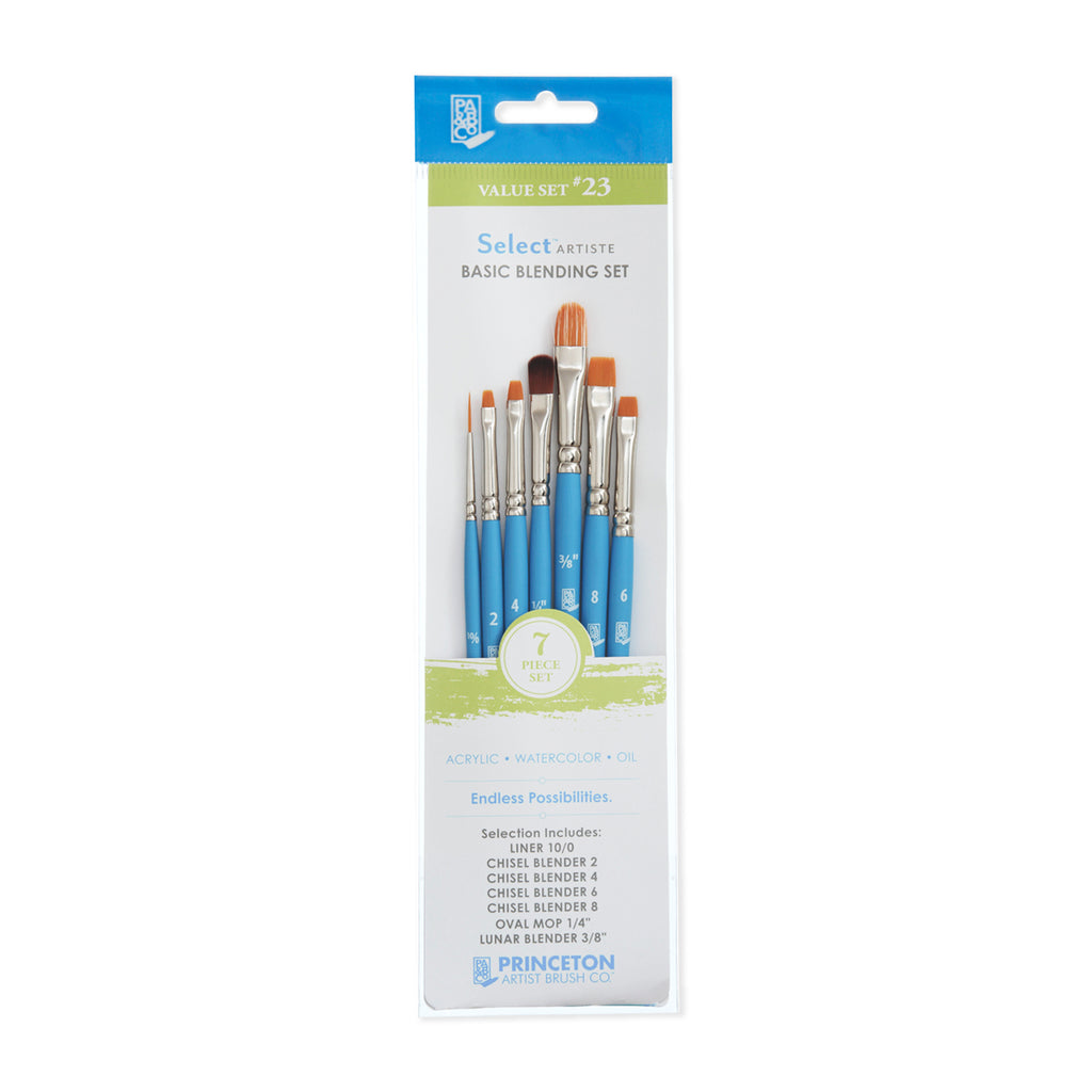 These value brush sets offer quality mixed media brushes at value pricing. The Princeton Select Artiste Series' perfectly designed yet distinctive shapes were developed by an artist for artists exploring decorative and avant-garde painting techniques. These high quality brushes mix the traditional with a sense of excitement and, like every Princeton brush, are handcrafted and tested for beautifully consistent performance. Short-handled, multi-media Select brushes range from synthetic to natural hair (traditional shapes & sizes contain blended golden taklon, and specialty shapes include a variety of natural hair & synthetic blends), all with matte turquoise handles and bright nickel-plated brass ferrules. Fine brushes for multiple mediums (acrylic, watercolour & oil) and techniques. Each thoughtfully selected mixed-media brush set contains an educational literature brochure. Unique shapes offer endless possibilities for artists. Set of 7 contains: Lunar Blender 3/8", Liner 10/0, Chisel Blender 2, Chisel Blender 4, Chisel Blender 6, Chisel Blender 8 & Oval Mop 1/4".