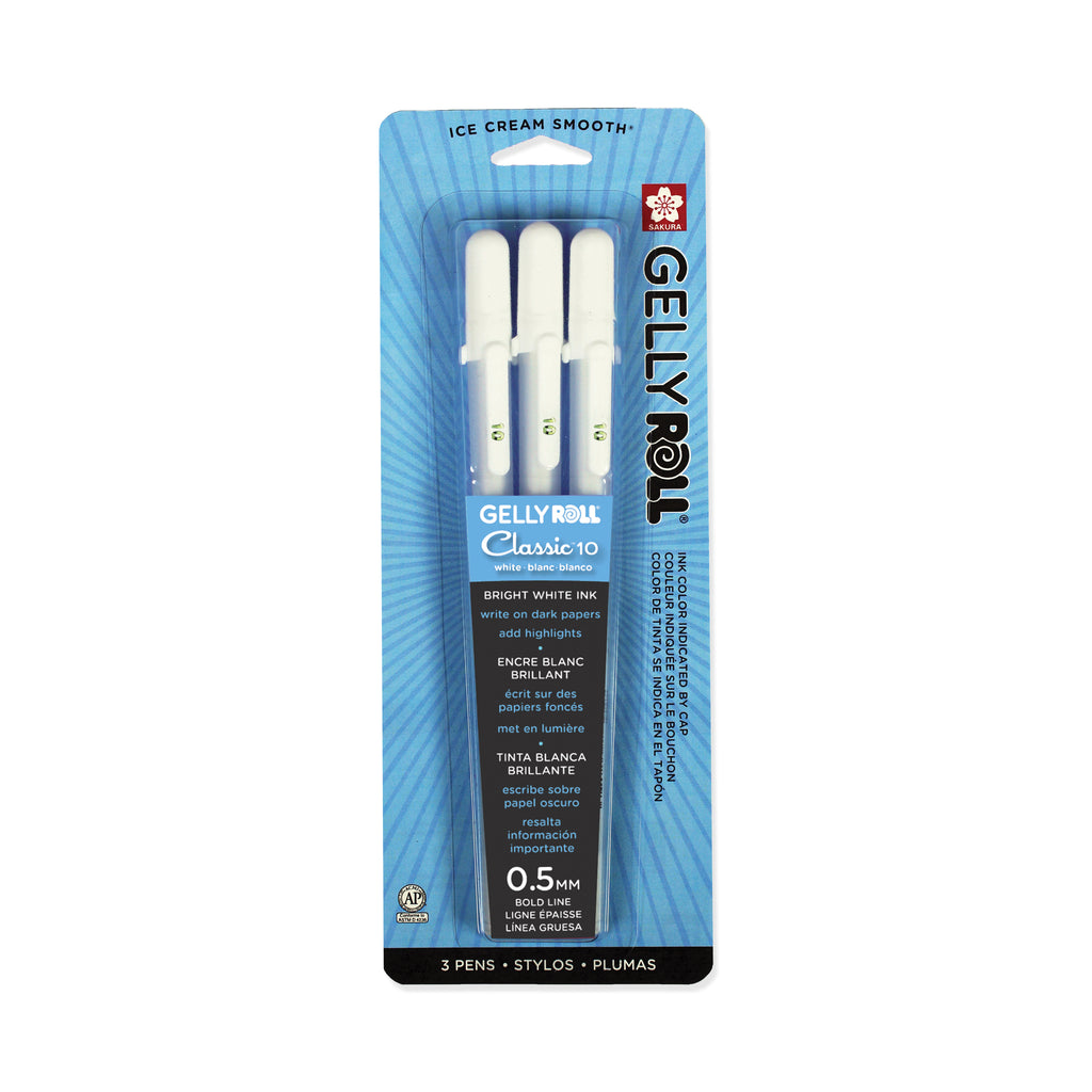 The opaque white ink stands out on dark and coloured papers! Works beautifully for highlights in illustration, comics and even watercolour. Use it for handlettering, party crafts, layered on top of colors for mixed media and add a broader range of value with bright highlights in tonal drawings. Perfect for intricate detail and unique bold marks. Contains 3 of the Bold (10) Classic White Gel Pen.