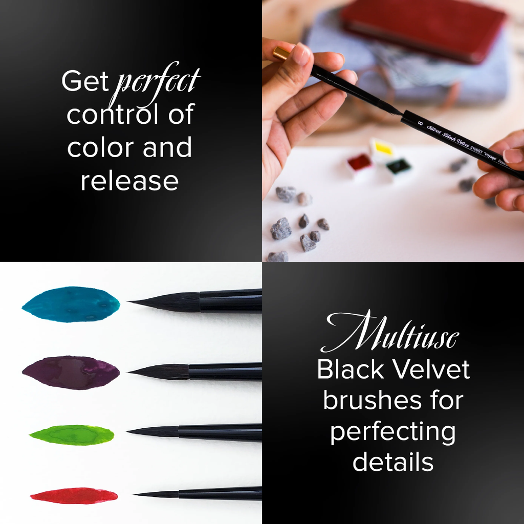BLACK VELVET: Black Velvet brushes were created for watercolor artists and skilled hobbyists. Each Black Velvet brush is soft enough to add color without disturbing previous layers but firm enough to lift color when needed.