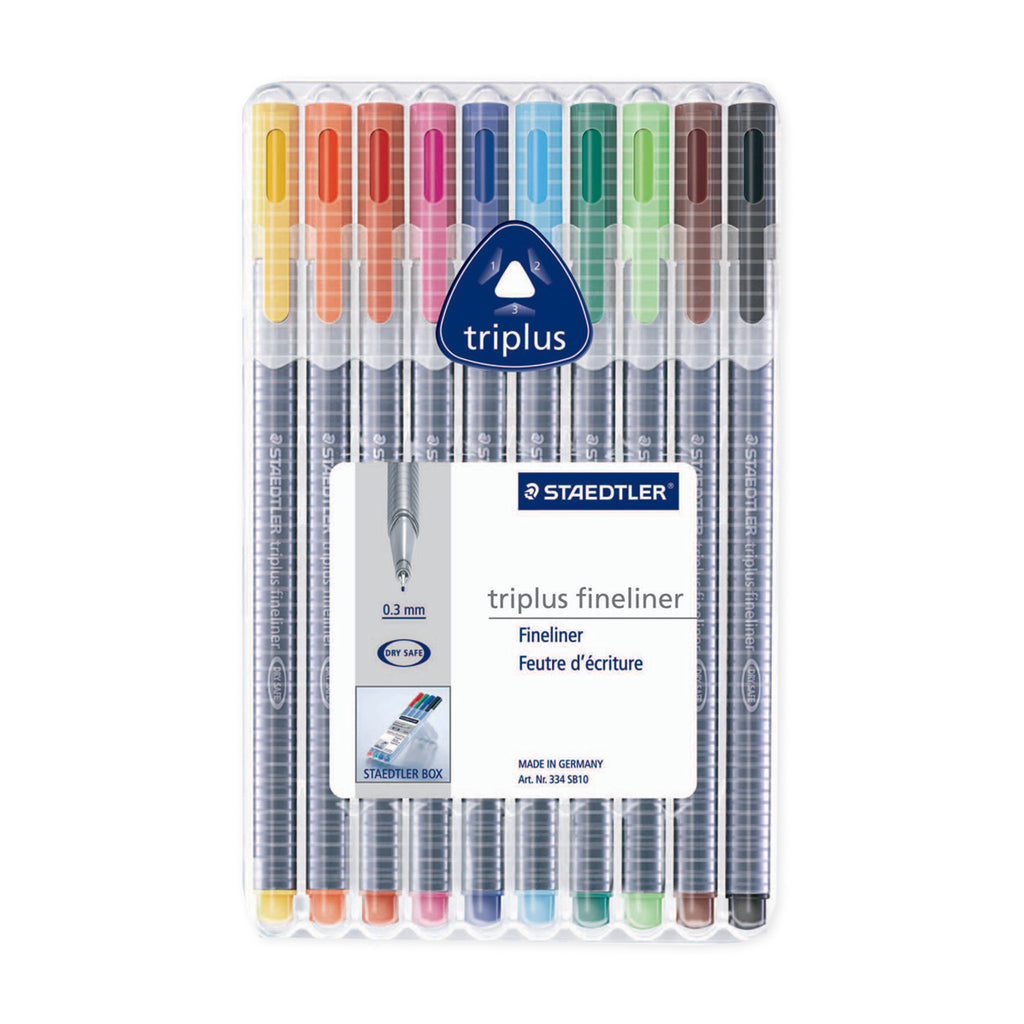 Fineliner with superfine (line width approximately 0.3mm), metal-clad tip and ergonomic triangular shape for relaxed and easy writing. DRY SAFE technology allows fineliner to be left uncapped for days without drying up (Standard atmosphere according to ISO 554, except neon colours). Water-based ink washes out of many textiles and has virtually no odour. Stand-up Staedtler box or easy organization.