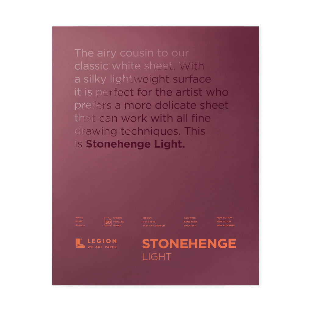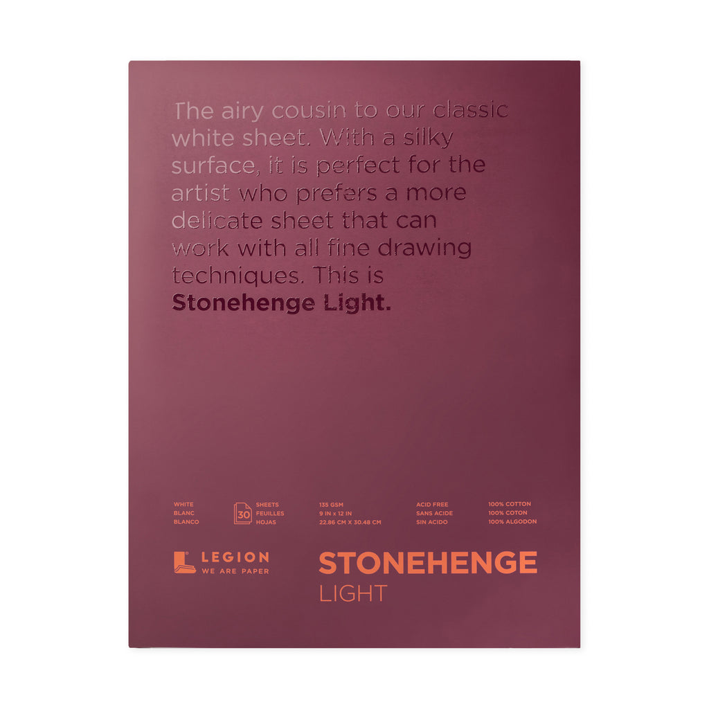 Just like the individual sheets, but in a convenient portable pad format. These pads contain Stonehenge paper that feature a smooth vellum finish surface. Made of 100% cotton fibers, they are pH neutral/acid-free. Great for applications such as printmaking, watercolour, pencil, pastel and pen and ink, making it an excellent general purpose paper. Stonehenge Light Pads feature 100% cotton paper with the same quality characteristics as heavier weight paper but is now available in a lighter 135gsm text weight. This is the optimum sheet for the artisan that specializes in fine drawing and prefers a lighter weight quality paper. Available in 30 sheet pads.