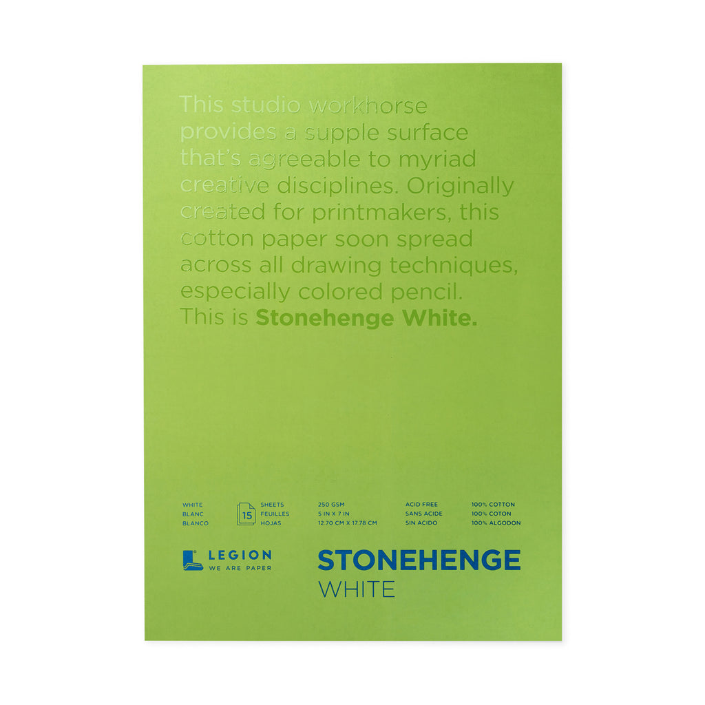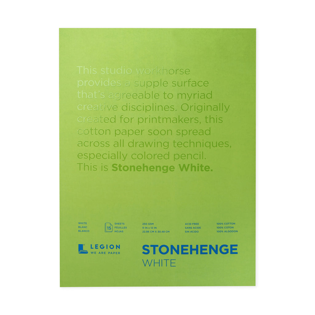 individual sheets, but in a convenient portable pad format. These pads contain Stonehenge paper that feature a smooth vellum finish surface. Made of 100% cotton fibers, they are pH neutral/acid-free. Great for applications such as printmaking, watercolour, pencil, pastel and pen and ink, making it an excellent general purpose paper. Stonehenge White Pads offer the convenience of portability while maintaining the same quality characteristics offered in Stonehenge sheets/rolls. Suitable for all drawing techniques. Available in 15 sheet pads.