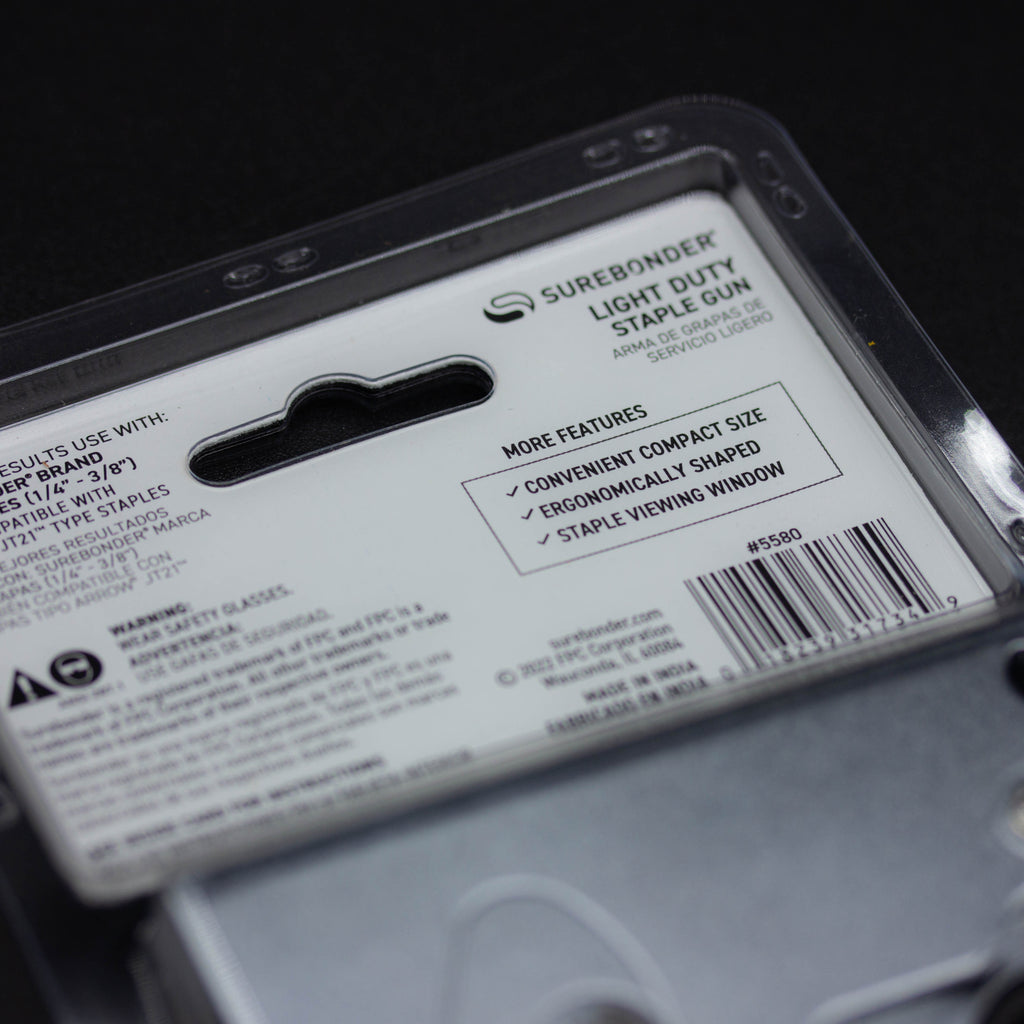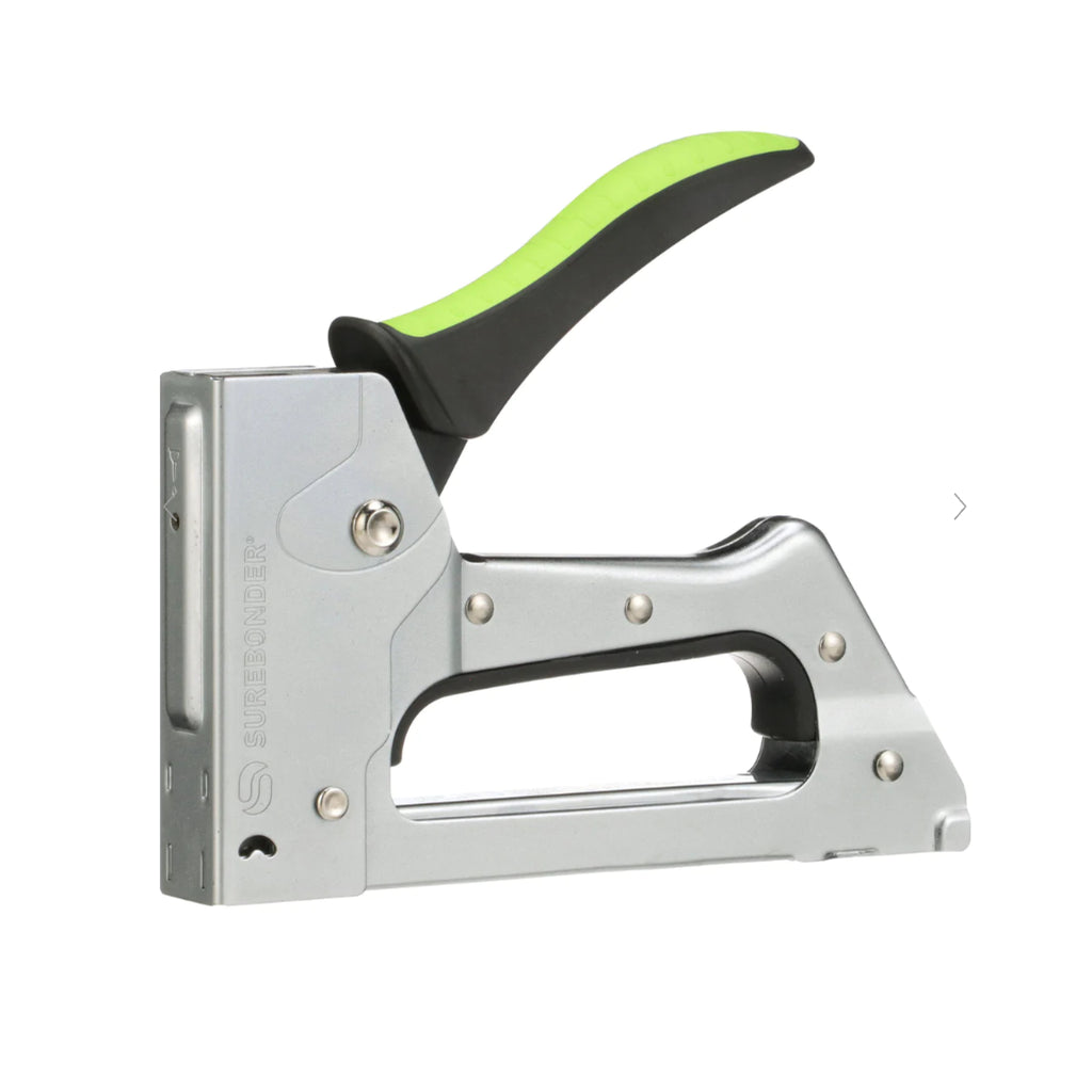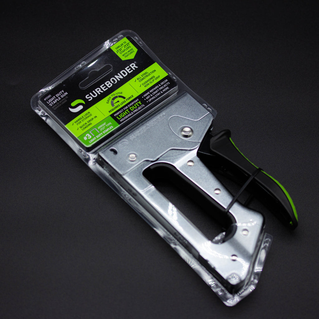 The light duty Surebonder staple gun's sturdy metal construction features an easy squeeze handle and drop-in staple loading. The staple gun is sold unloaded and will accept 1/4", 5/16" and 3/8" staples.