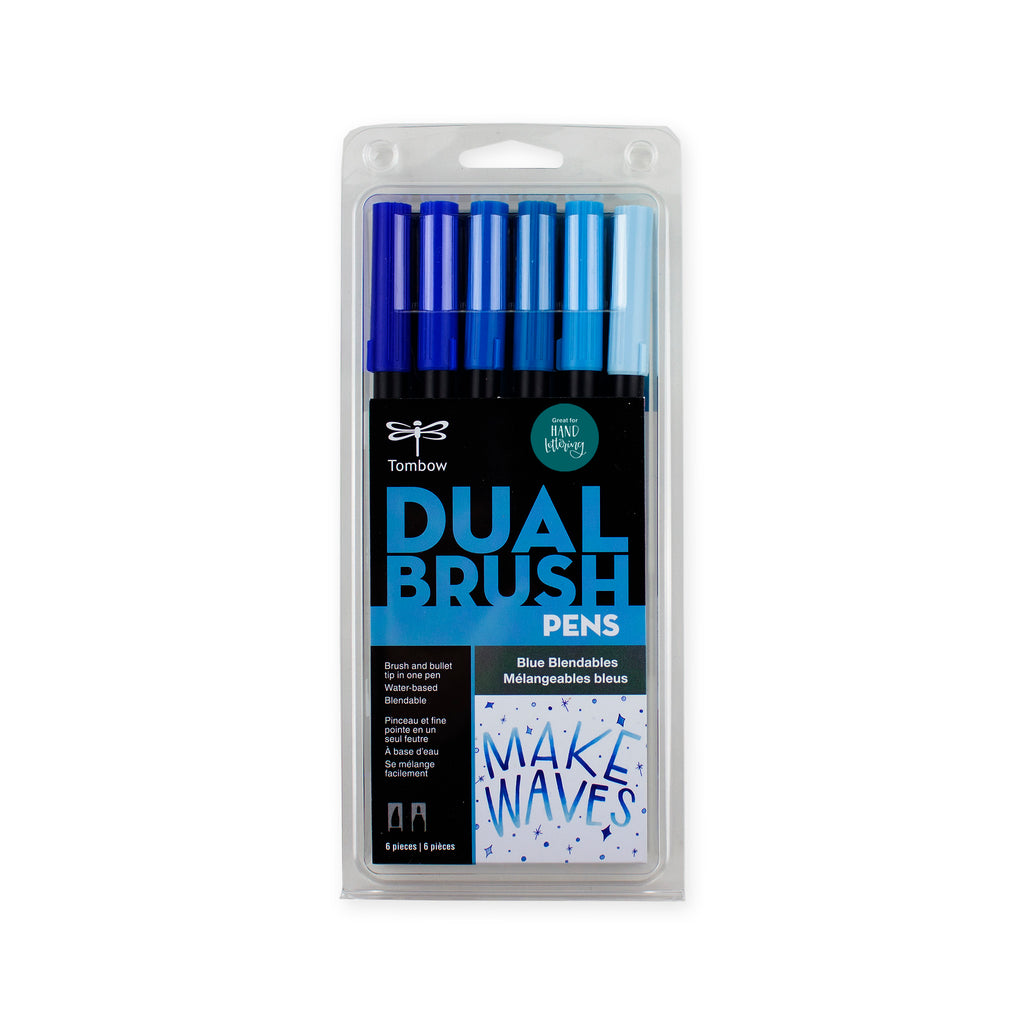 Set of 6 Dual Brush Pen colours. Flexible brush tip and fine tip in one marker. Brush tip works like a paintbrush to create fine, medium or bold strokes; fine tip gives consistent lines. Dual Brush Pens are ideal for artists and crafters. The water-based ink is blendable and the resilient nylon brush retains its point stroke after stroke. Ideal for colouring, fine art, illustrations, doodling, journaling, hand lettering and more. Water-based, Blendable, Acid-free, odourless. Tips self-clean after blending. For best results, use a smooth, non-textured paper.