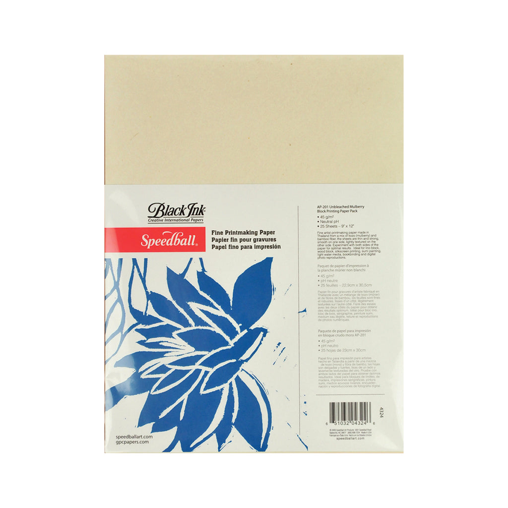 This 9" x 12" unbleached 45g/m2 artist block printing paper has a neutral pH and is made in Thailand of mulberry and bamboo fiber. The sheets are thin, but strong, smooth on one side and lightly textured on the other side. It is ideal for lino block, wood block, silkscreen printing, sumi painting, light water media, bookbinding and digital photo reproductions.
