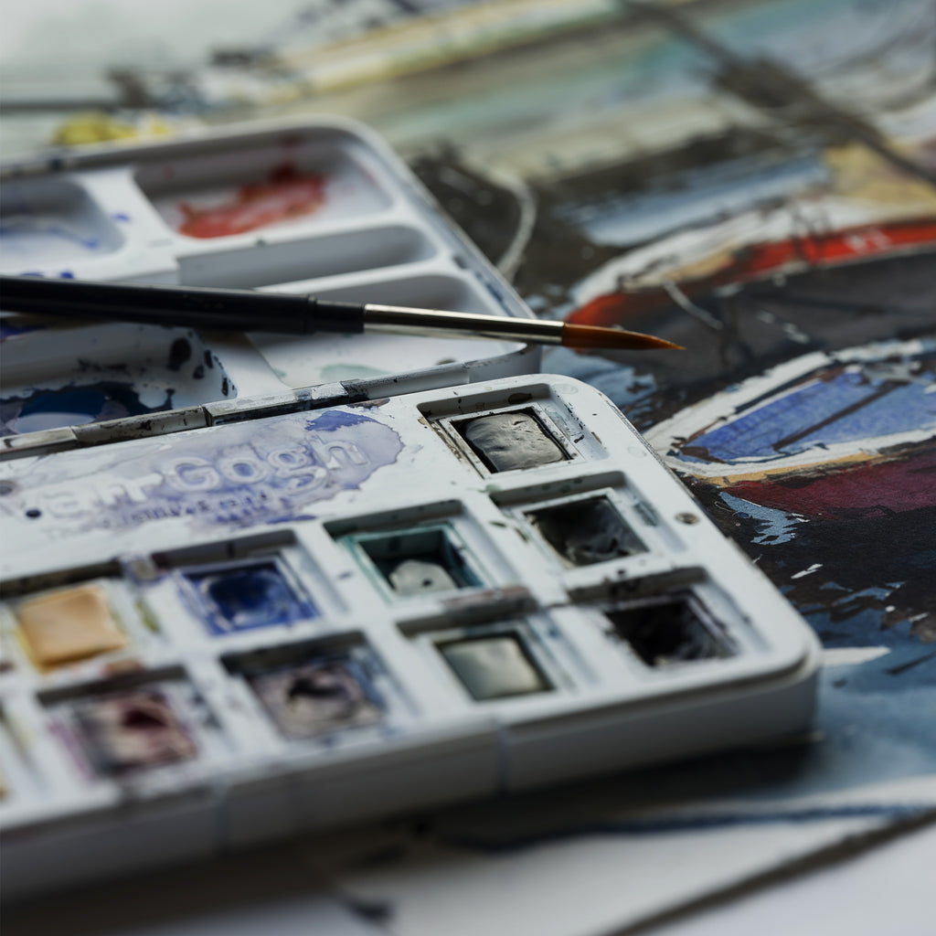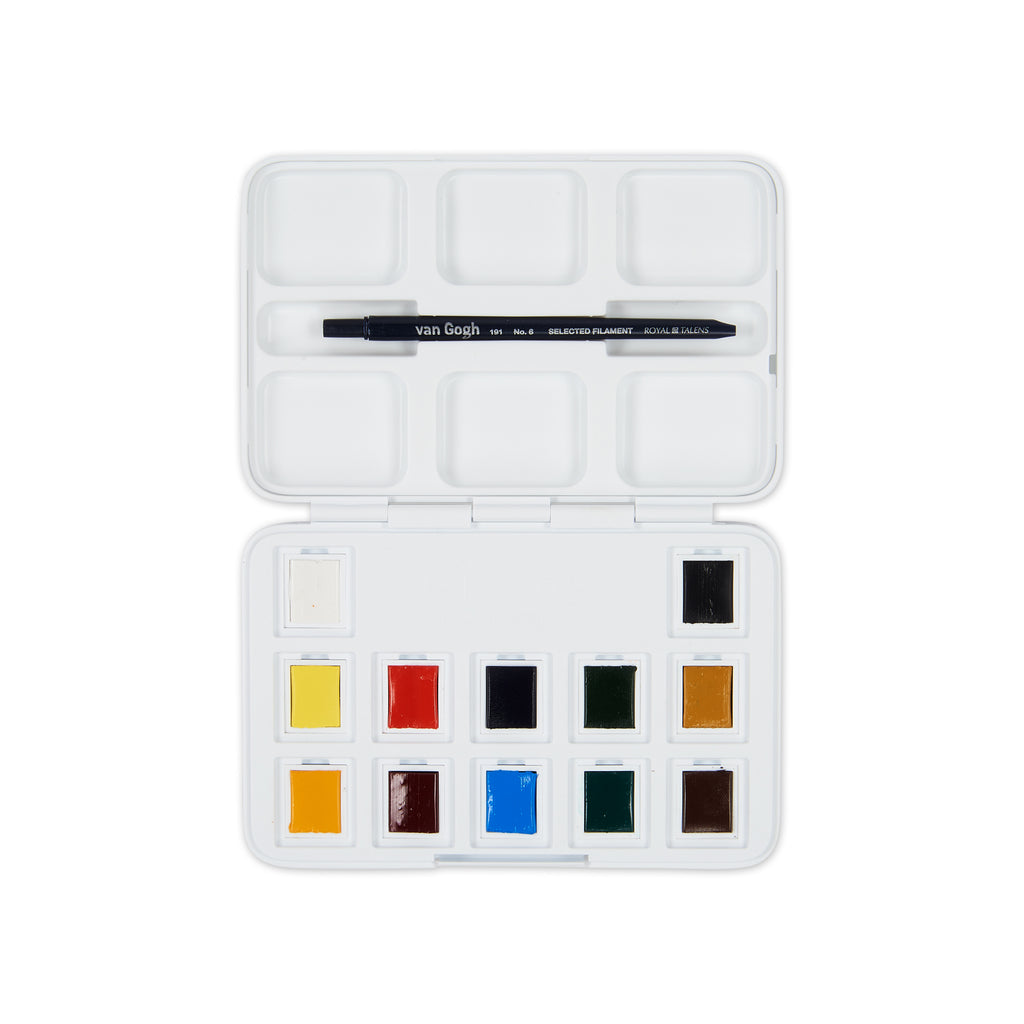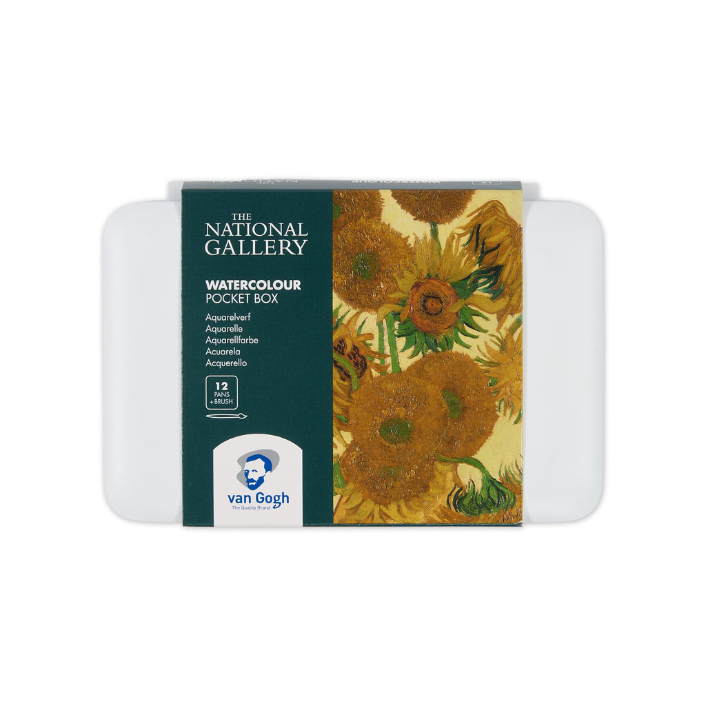 Van Gogh watercolours are a transparent paint with intense colours. All colours have the highest degree of lightfastness. Thanks to their purity you can easily mix and wash the colours to the finest of nuances and lively colours are the result! Watercolor pan pocket boxes are an essential for any plein air sketcher - with a built-in palette and handy brush, any on-the-go-artist will instantly fall in love with these sets. The National Gallery set offers 12 vital colours for landscape, portrait, still life and everything in between. This set is part of the National Gallery Collection as a tribute to its grand collection of paintings such as Monet's Water-Lily Pond and Van Gogh's Sunflowers. Set contains: Permanent Lemon Yellow, Azo Yellow Medium, Permanent Red Light, Madder Lake Deep, Ultramarine Deep, Cerulean Blue Phthalo, Sap Green, Viridian, Yellow Ochre, Burnt Sienna, Chinese White, Payne's Grey. Plus 1 brush.