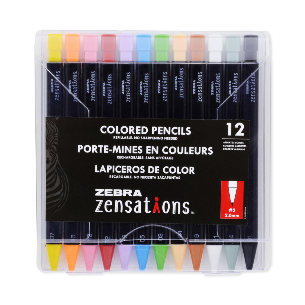 Easy to hold, colourful and bold! Zensations Mechanical Colored Pencils provide smooth, rich, vibrant colors that blend easily for shading and color mixtures. With a triangular barrel that is easy to hold, it provides excellent control while coloring or sketching. The 2.0mm lead is durable and long lasting. Never needs sharpening - Try them in your bullet journal - Triangular barrel prevents rolling - AP Certified Non-Toxic - Available Point size: 2.0mm.